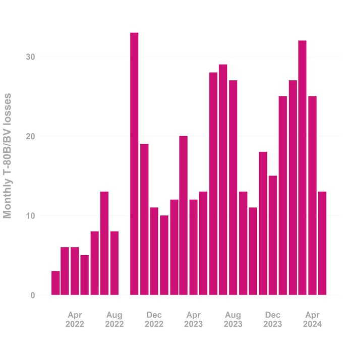 8/ In this chart (by @whitherapathy) you can see that Oryx records more than 20 T-80B/BV losses in some months. If we assume that the only T-80B/BVs being sent to the front by now are repaired units then the active fleet might shrink to 380-580 tanks by the end of the year.