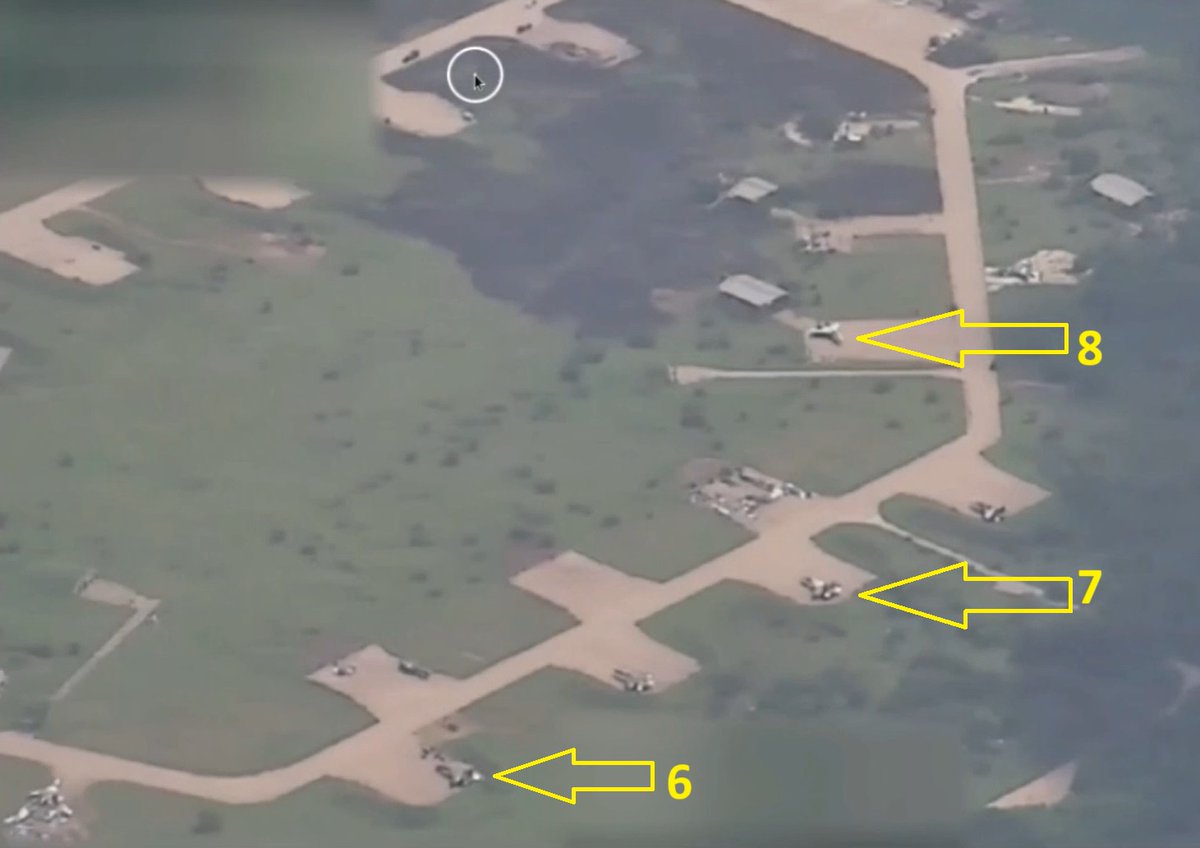 First frames of the video show the situation before the attack. Numbers 1 & 4 are Su-27s parked in the same spot for many month, almost certainly retired airframes. Number 2 & 3 weren't there few days ago, either operational jets or retired airframes used as decoys.