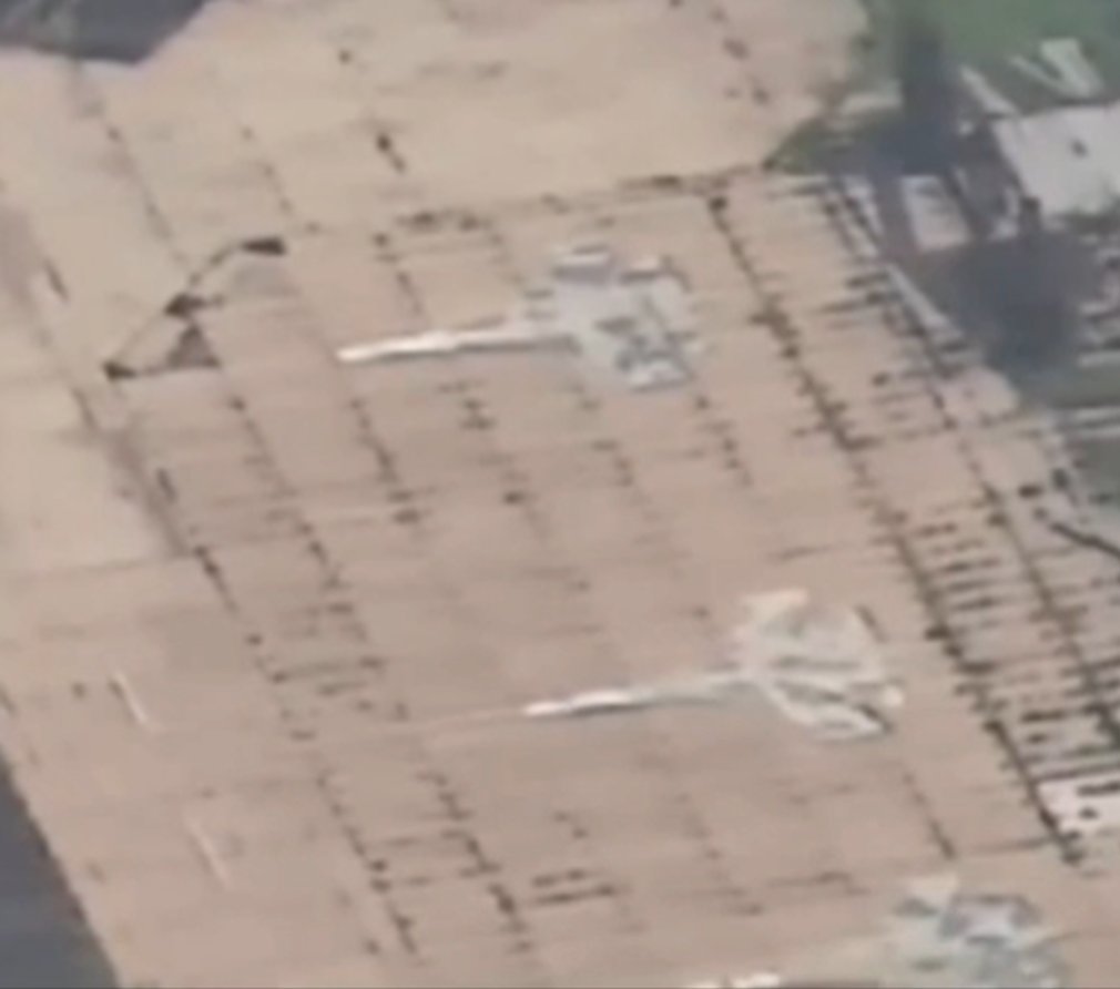 Same sat photo, but more contrasted was published by @Tatarigami_UA The dispersal pattern is more visible here. I think we can safely assume that all helicopters in this area were riddled with shrapnel and are damaged beyond repair.