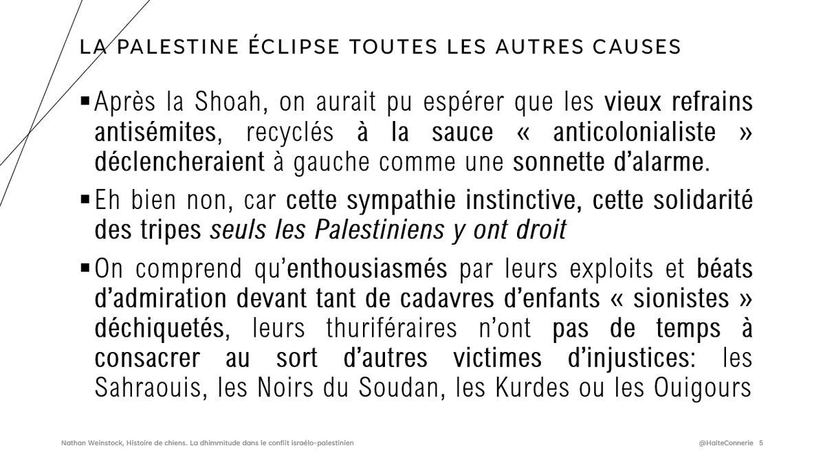 Le retour du refoulé antisémite explique ainsi pourquoi "seuls les Palestiniens ont droit à cette solidarité des tripes" qui pourrait pourtant trouver à s'exprimer dans de nombreuses crises à travers le monde (et déjà le Soudan, les Kurdes, les Ouigours)