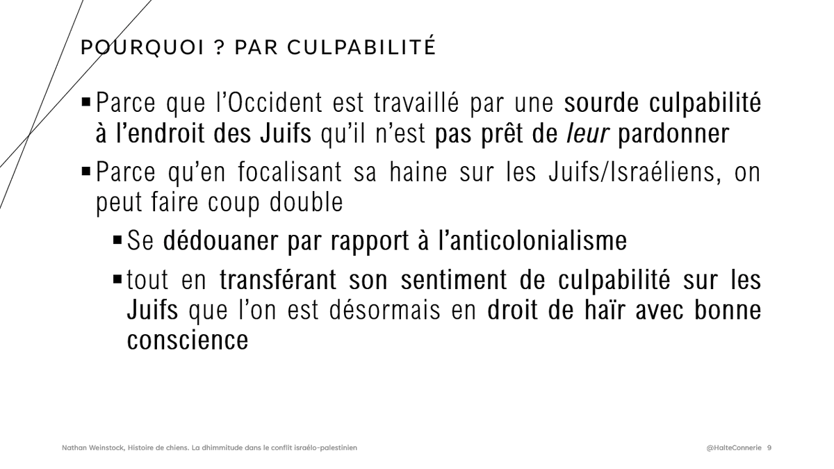 Mais quel mécanisme psychologique est donc en jeu ? La volonté d'échapper à une double culpabilité : le colonialisme et la Shoah afin de pouvoir haïr le Juif/Israélien en toute bonne conscience.