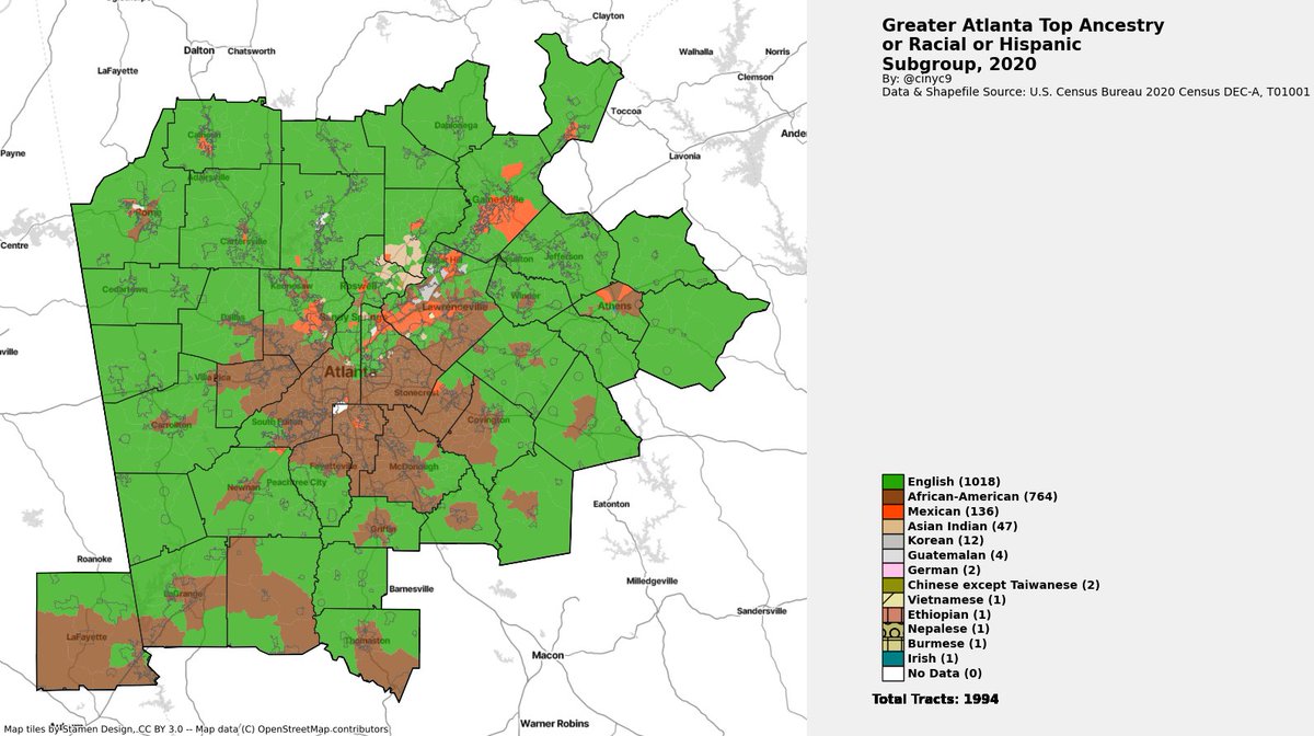 Finally (for now) Greater Atlanta is CSA #10. Since Census didn't separately report those who self-reported themselves as American, English is now tops in a majority of tracts. African-American is next.
