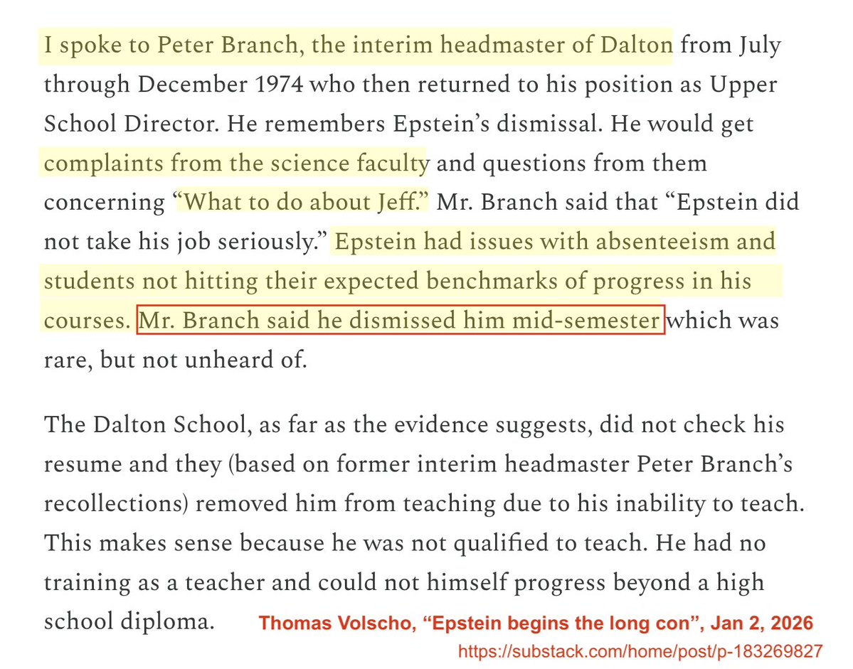The Epstein files show his wild geopolitical schemes, but realize: he was a huckster who conned his way up; his friends called him dumb. He may have been a tool. @TVolscho digs up early details: Epstein lied to get a Dalton job, got fired mid-semester since he couldn't teach. 1/