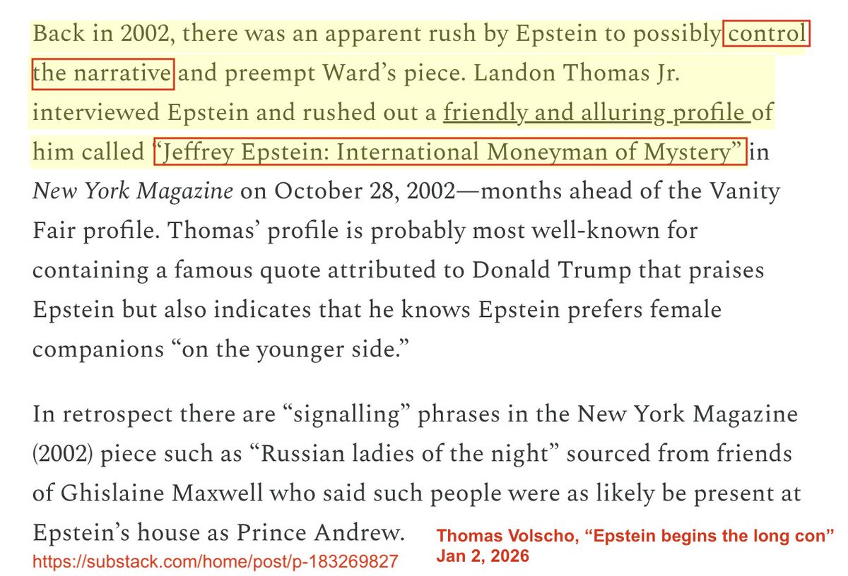 As Epstein's emails show the extent of his ties to global elites, we have to manage the contradictions. Epstein curated his image, working the press. He was a genius at the con. But he was not likely the creator of all the schemes he pitched. Who was? 3/ substack.com/home/post/p-18…