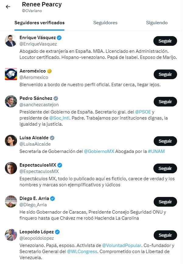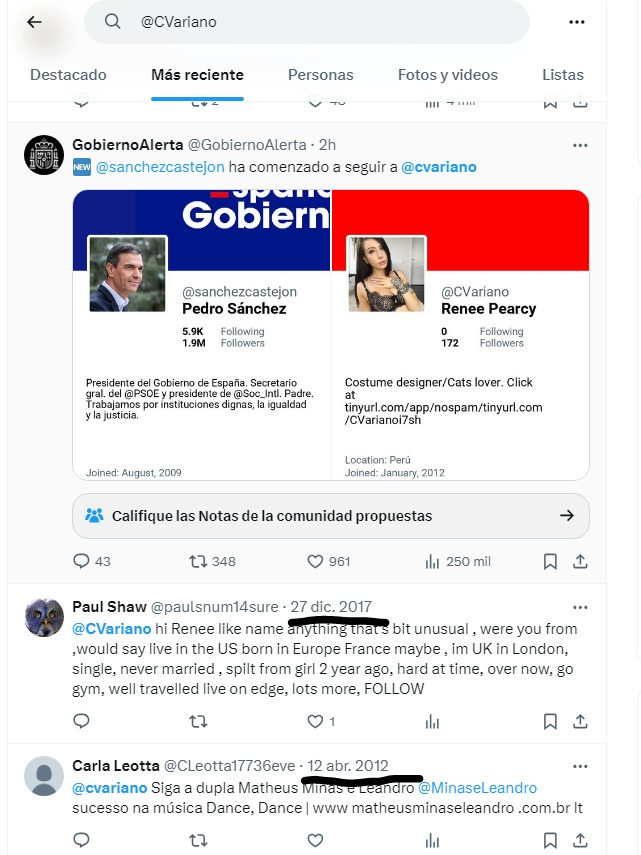 En la primera imagen se ven las menciones de la cuenta ordenadas temporalmente donde se puede comprobar que solo tuvo actividad muy puntual en 2012, en 2017 y ahora con el seguimiento de Pedro. Lo llamativo es que también la siguen numerosas autoridades, algo muy extraño.