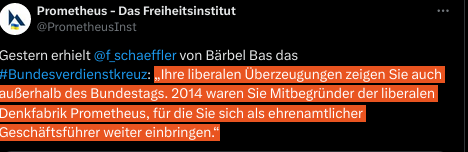 Bei der Verleihung lobte Bundestagspräsidentin Bas Schäffler offenbar auch für sein ehrenamtliches Engagement bei Prometheus. Aber: Prometheus ist eine hochproblematische wie intransparente Lobby-Denkfabrik und kein Nachbarschaftsverband! /5