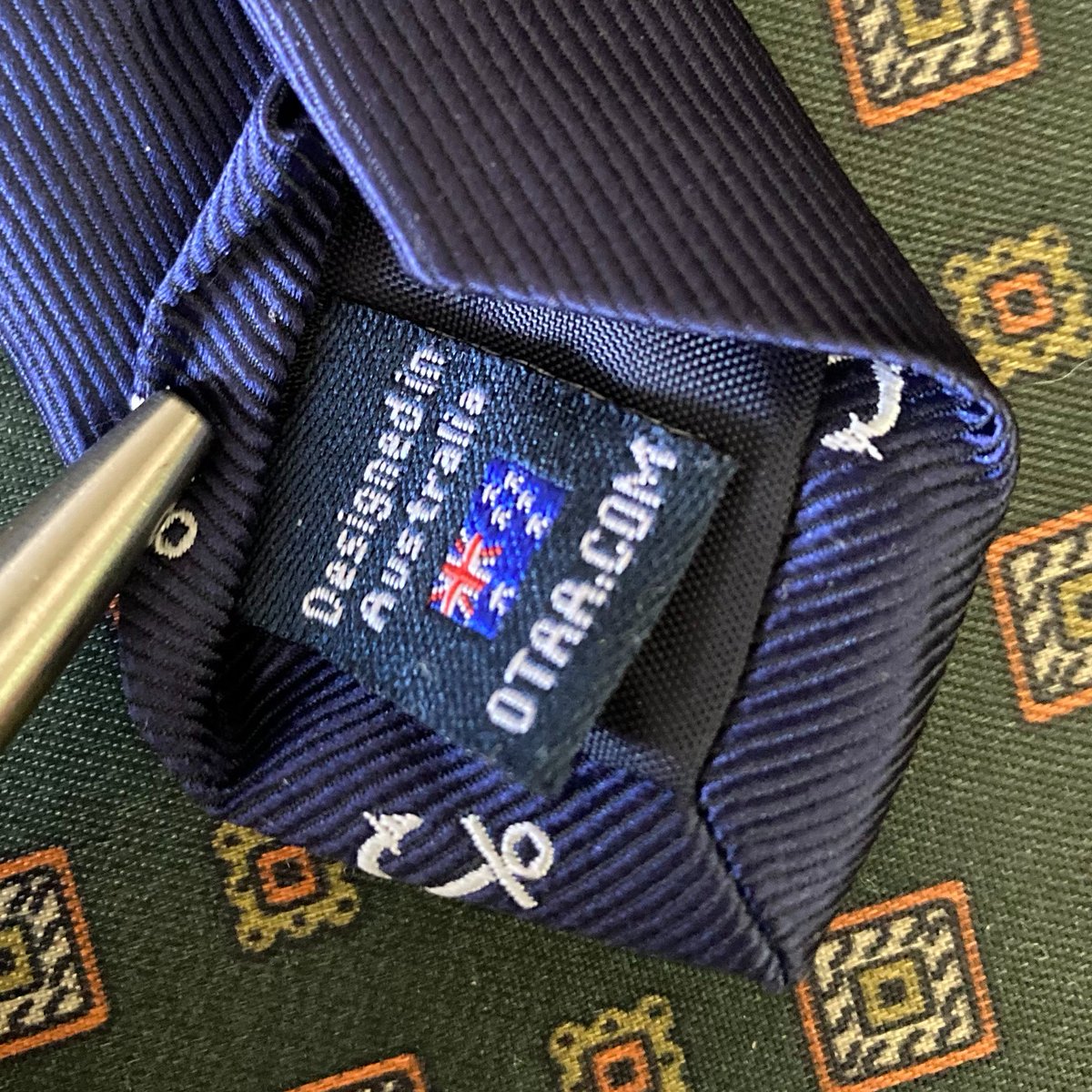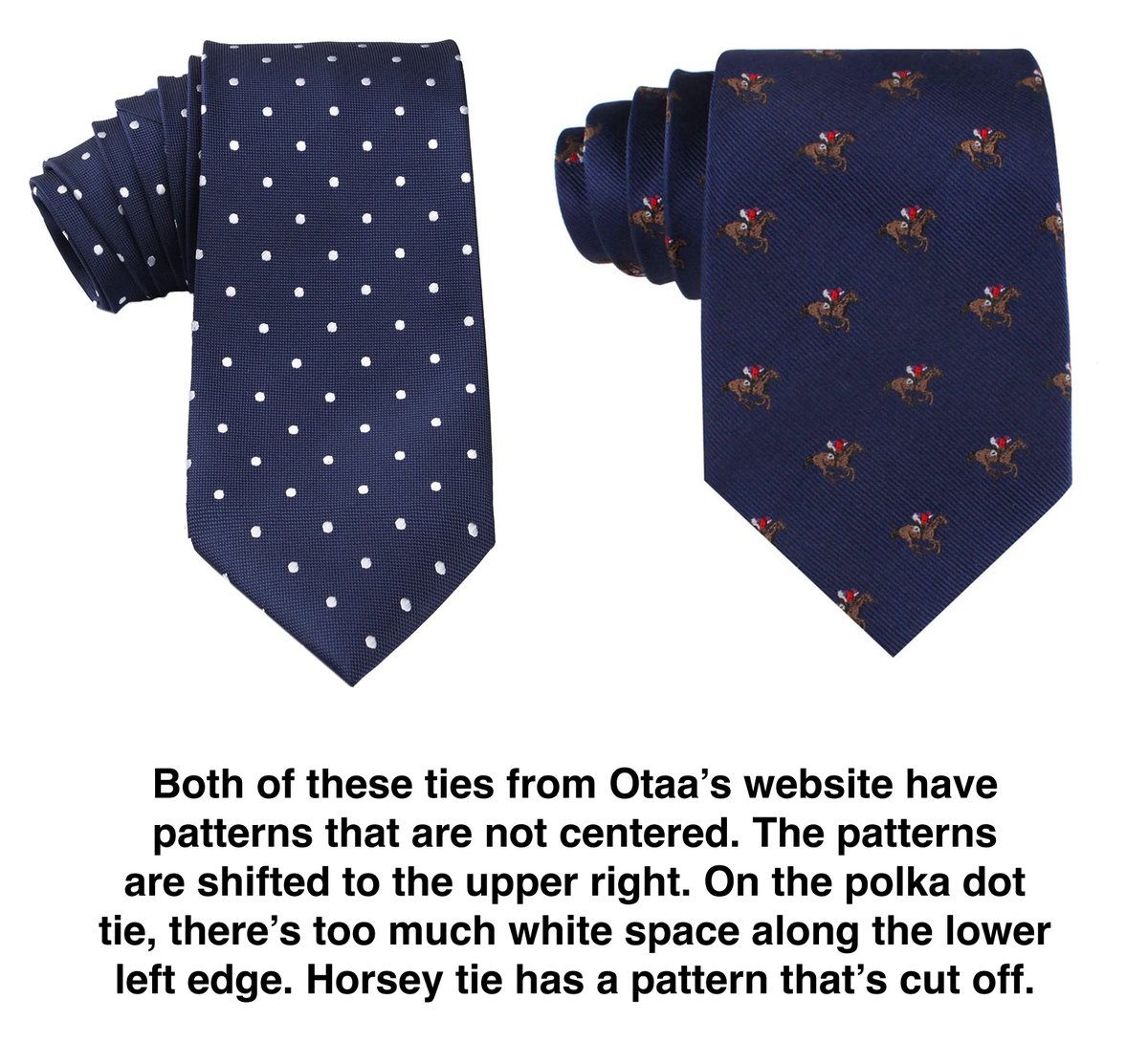 When placing the paper pattern down on the fabric, the cutter should make sure the fabric's pattern is centered. The anchor pattern on my Otaa tie is mostly centered, but many ties on their website are not. This shows poor quality control.
