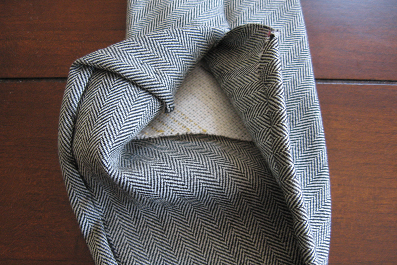 Now, let's flip the tie over. A high-quality tie should be "self tipped," which means the back of the blade is finished with the same shell fabric. This shows the maker spared no cost. Or it can be "untipped," at which point, the edges should be hand-rolled and -sewn.