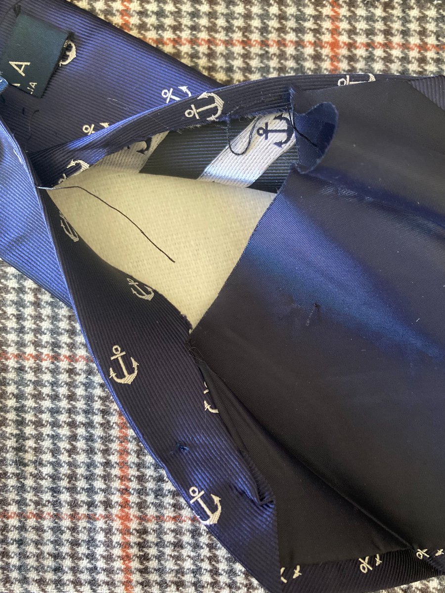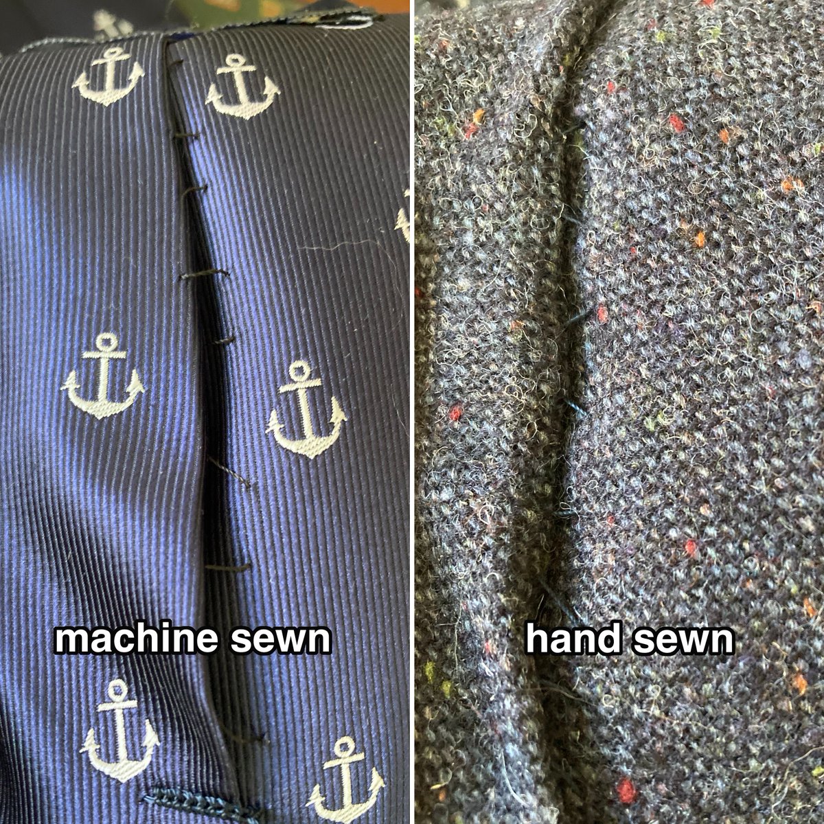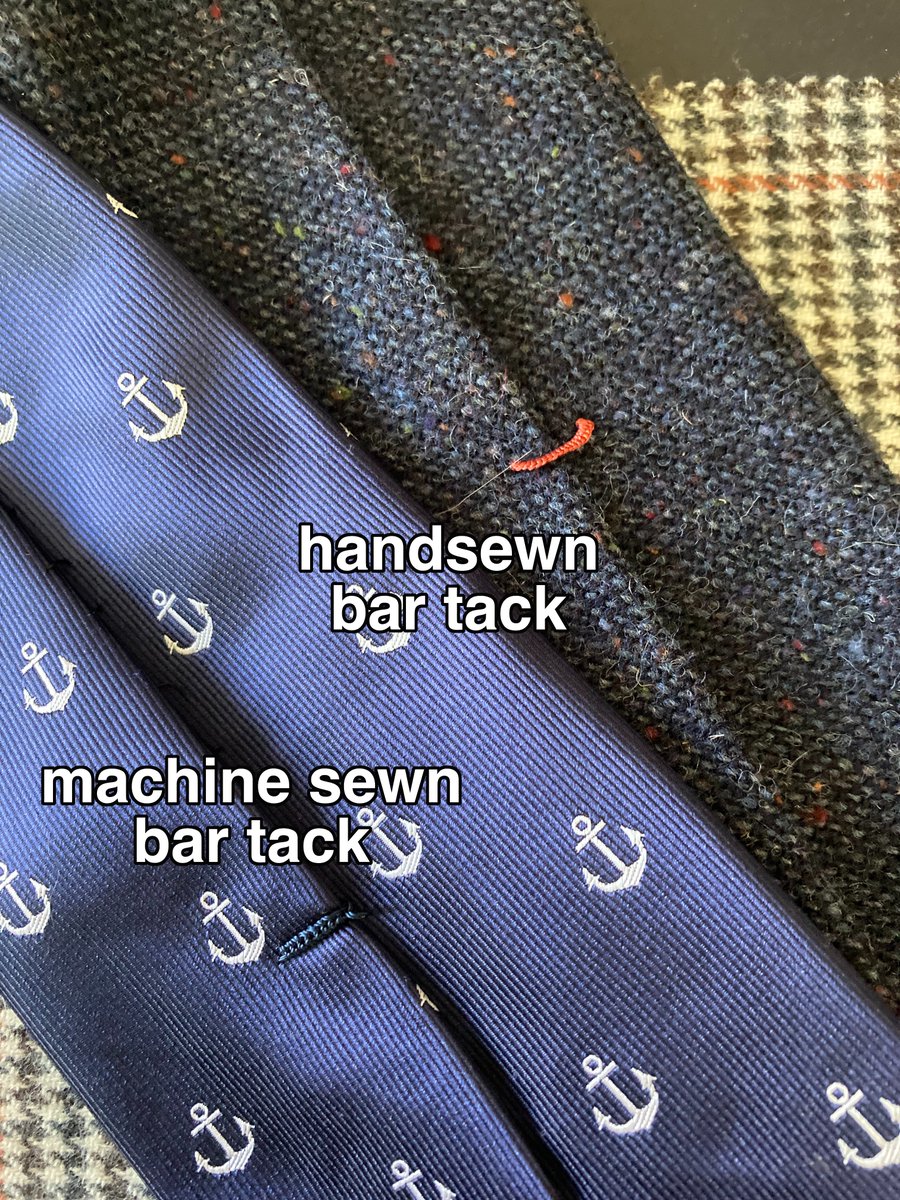Next is the sewing. A quality tie will have a handsewn slip-stitch running up the tie's spine. The bar tacks will also be sewn by hand. This handsewn slip-stitch will have more give than a machine-made lockstitch. It also shows a bit of craftsmanship. A video is from Tom James:
