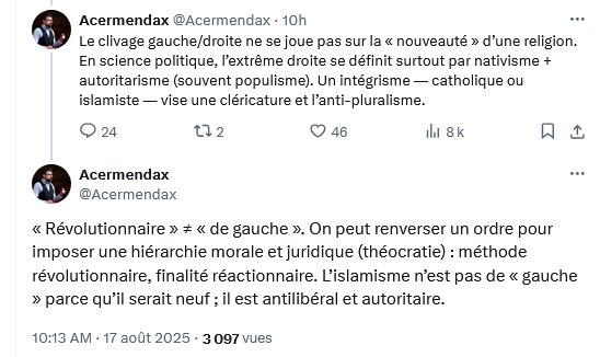 1/ Affirmer que l'islam(isme) serait d'extrême-droite ne sert qu'à rejeter à droite tout ce qui est mal, afin de défendre la fiction absurde selon laquelle la gauche serait le Bien.