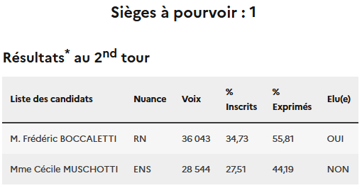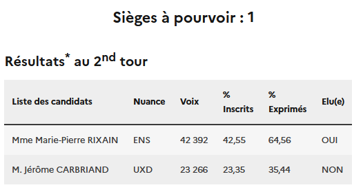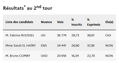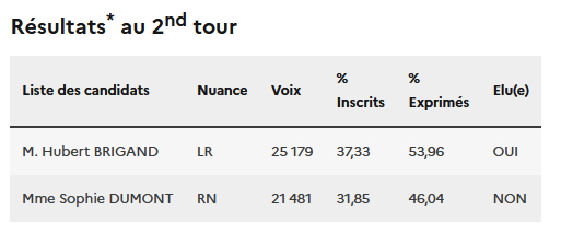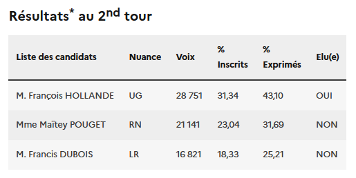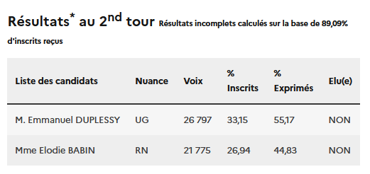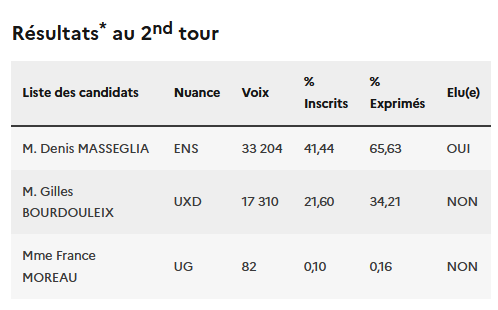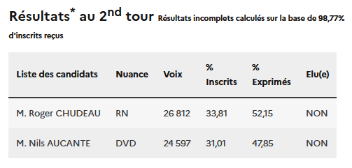 Ah et bien sûr : Gilles Bourdouleix, qui avair fait mine de se désister et s'était retrouvé au final en triangulaire (pouvant l'avantager), est BATTU.