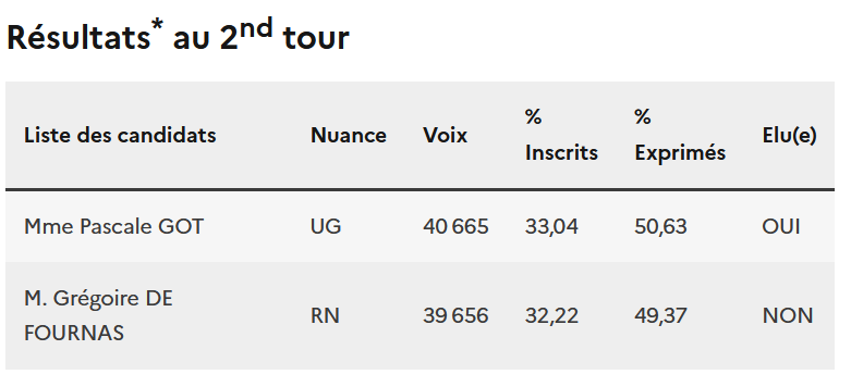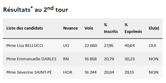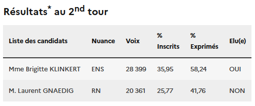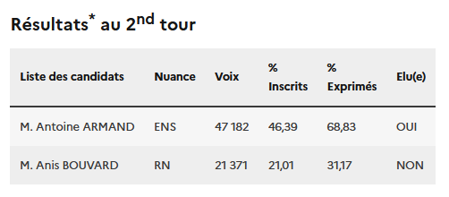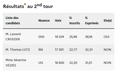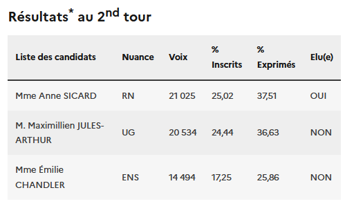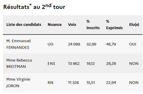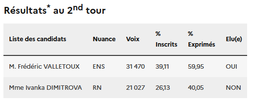 La candidate NFP, qui s'était maintenue pensant être en duel contre Ensemble, n'a pas présenté de bulletins (0,16%)