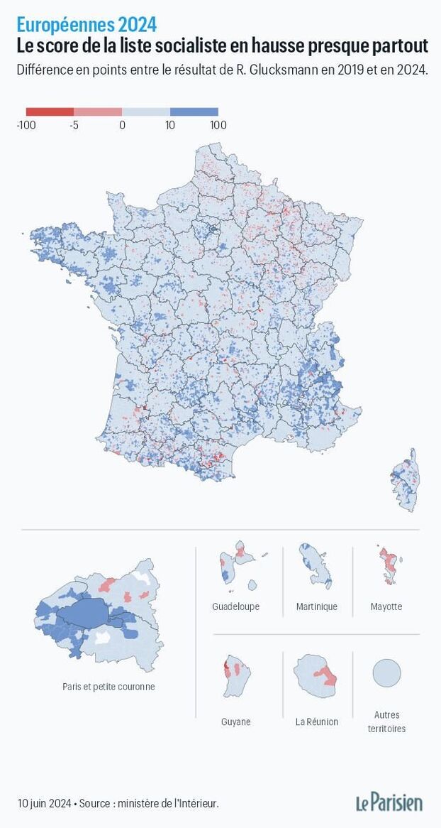 On enchaîne avec le Parti socialiste, qui a fait ses meilleurs scores dans ses "bastions" traditionnels de l'ouest et du sud-ouest et qui progresse quasiment partout en France par rapport à 2019.