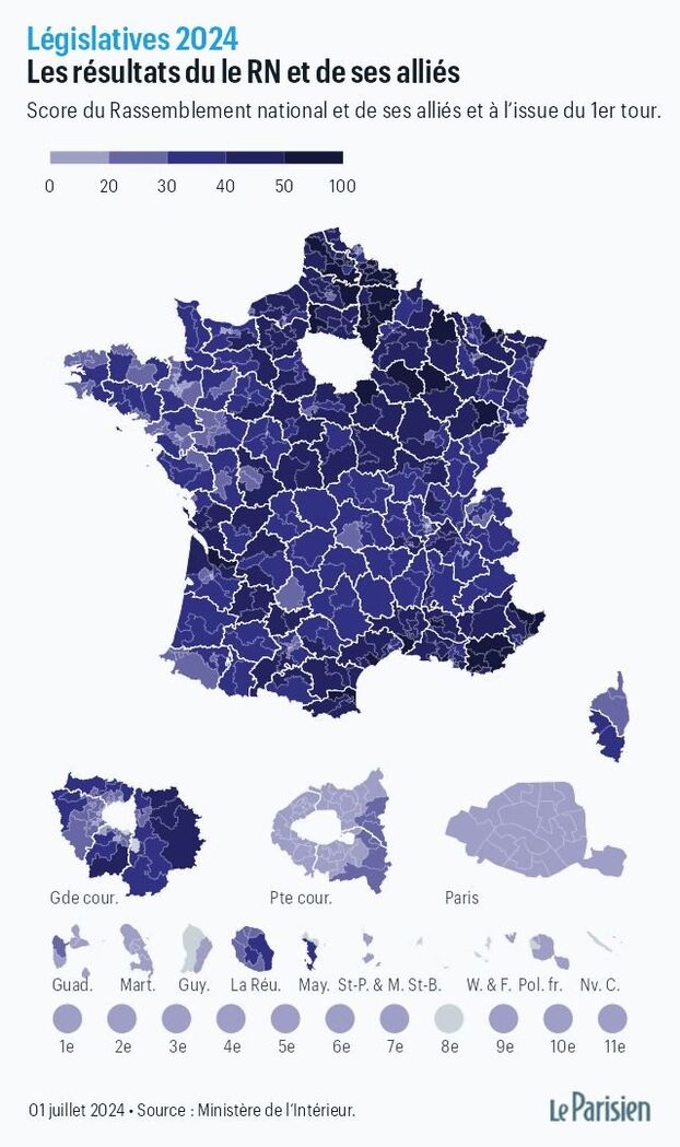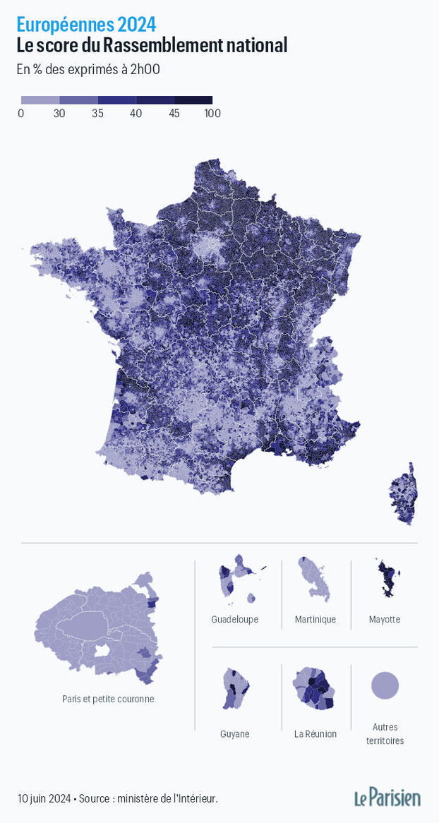On commence avec le RN et ses alliés : scores les plus élevés dans le nord-est et le sud-est, et en hausse partout.