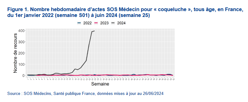 Il y en a eu 400 pour #coqueluche l'an dernier, et on voit la très forte hausse depuis le début du printemps après deux années de "sommeil" de la maladie.