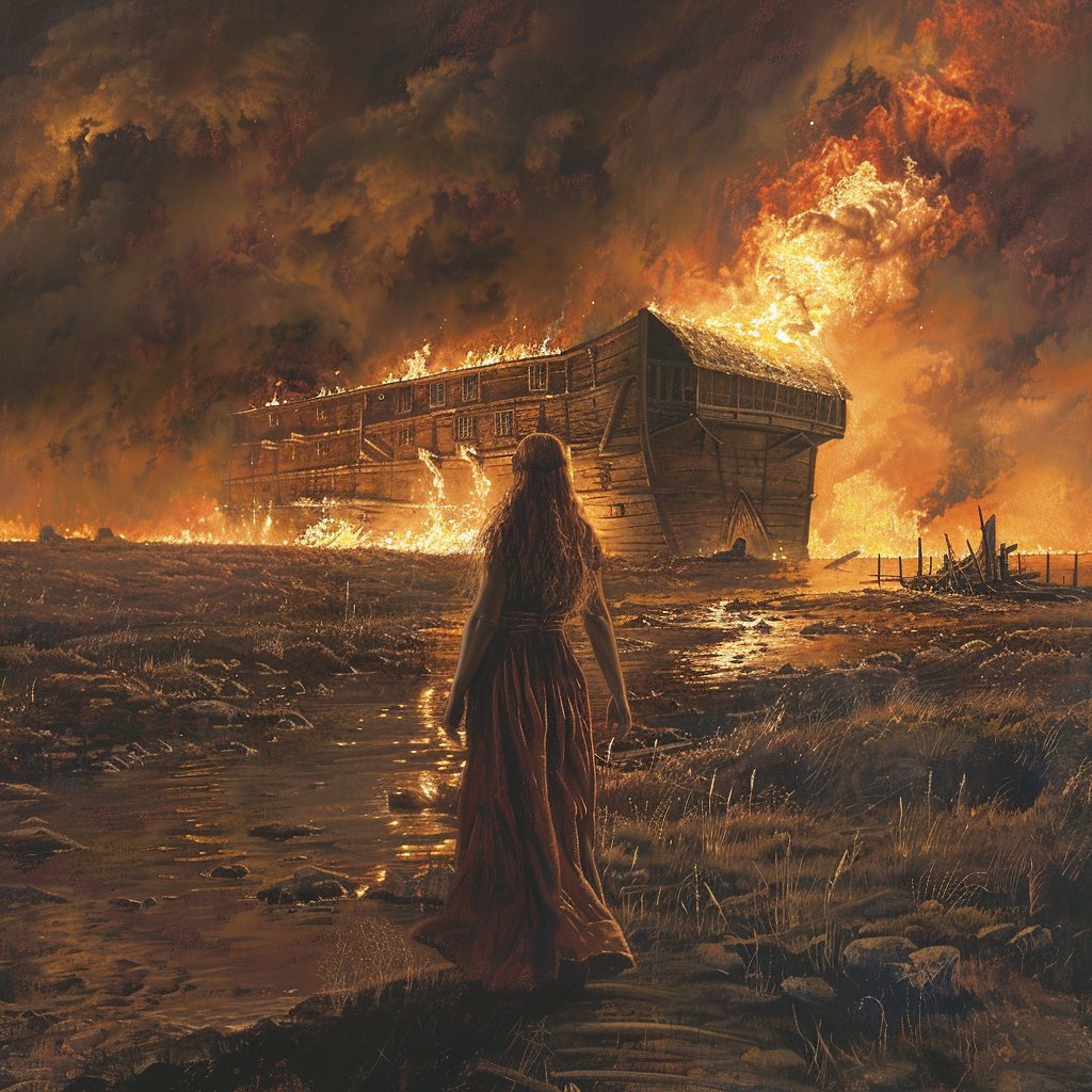 The Gnostic "Hypostasis of Archons" holds that Norea a sister of Seth, was refused access to the Ark and thus she burnt it down(thrice). The Archons in response try to rape Norea but Eleleth an angel saves her-