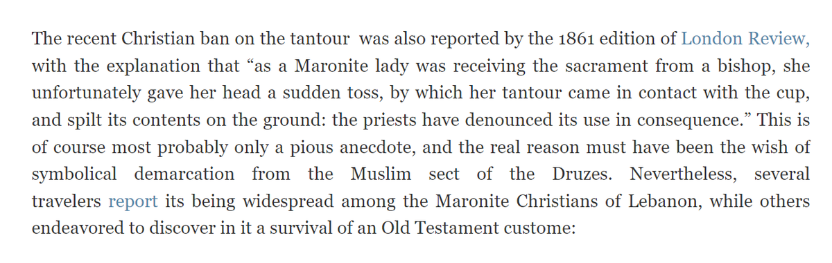 Maronite Sheikhs had taken the Tantur tradition from Druze as well. The Clergy believed that the Druze found an Idol with the Tantour in Primordial Sarcophagi, thus it was idolatry and banned it. There was also an incident when a Woman accidentally hit a priest with the Tantour