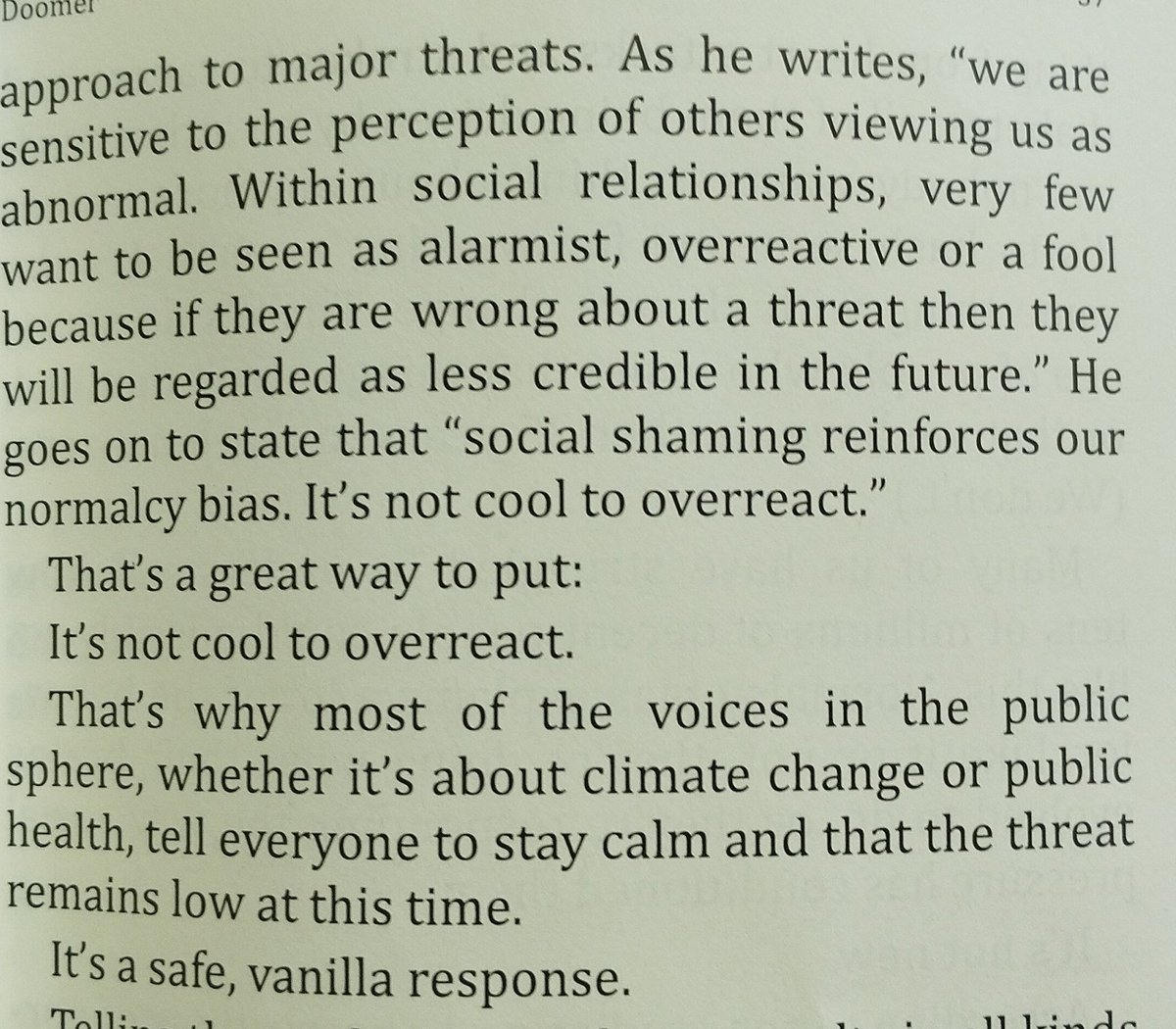 Mein bester Erkläransatz (unterstützt von @JessicaLexicus Buch "#Doomer") ist die Auswirkung von "Normalcy Bias".