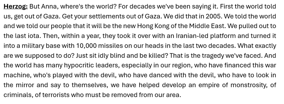 Raz cites these words by Herzog as genocidal intent: “This war is a war that is not only between Israel and Hamas. It's a war that is intended really, truly, to save Western civilization.” Segal wildly falsifies the meaning of Herzog's Dec 2023 interview, as shown next. 2/