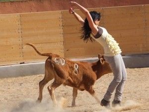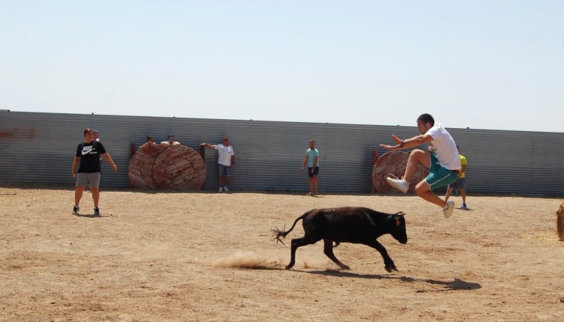 spettatori appassionati a proprio rischio e pericolo, anche le "vaqilles" giovani vitelle esuberanti anch'esse utilizzate nell'arena, al mattino, per le prove libere di coraggio dei giovani che le sfidano provocandone la reazione di carica. Anche in questo caso avvengono molti ⤵️