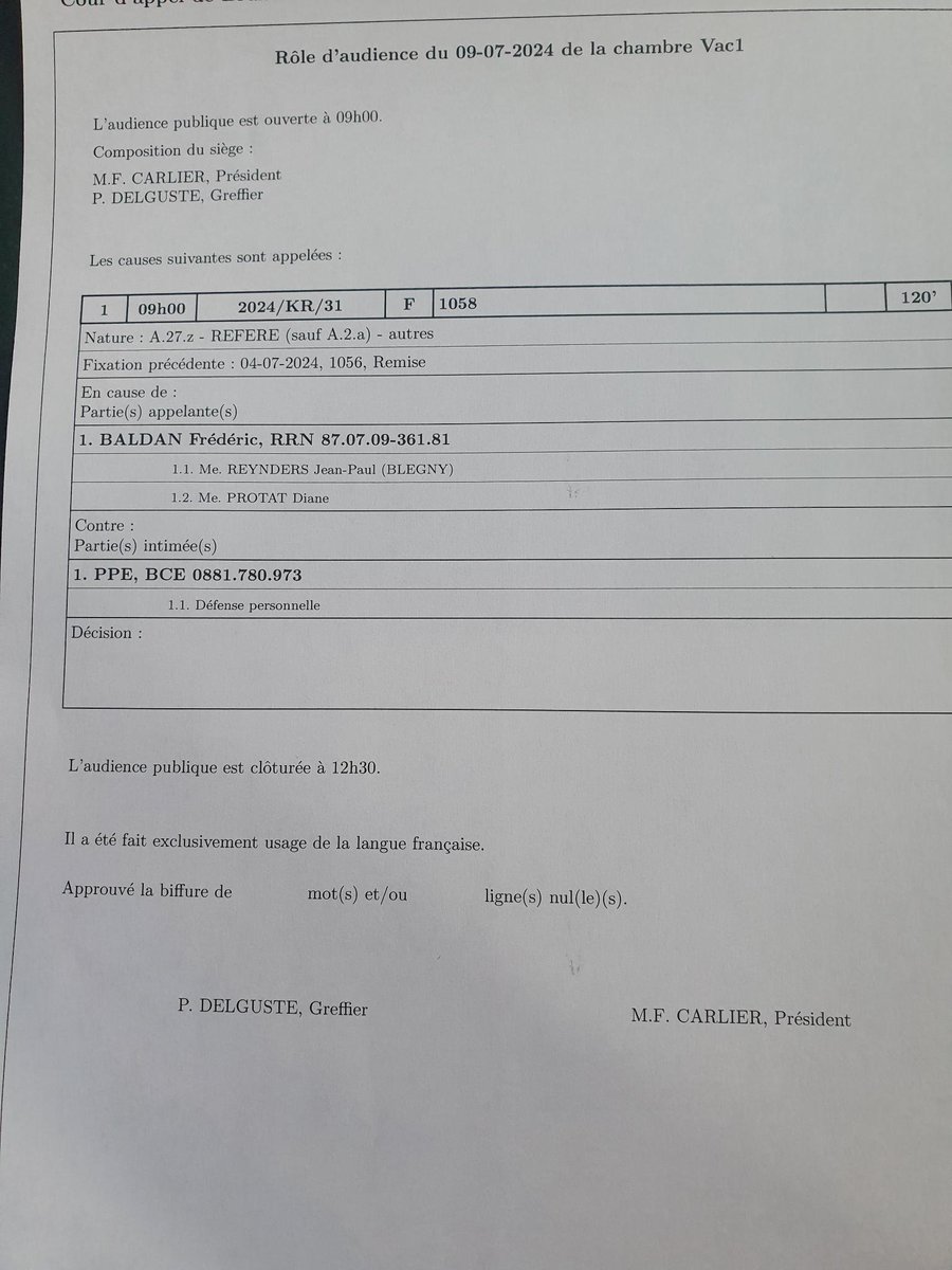#ursulagates La présidente M.F Carlier ouvre la séance à 9 h. La feuille de présence ne mentionne pas la constitution d'un avocat.