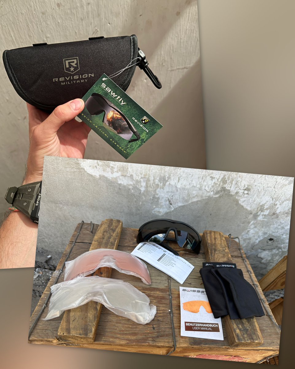 📍Окуляри балістичні. Та ж історія, що з броніком та шоломом – багато різного, але все нормальне. У нас видають або Revision, або SwissEye з трьома змінними лінзами.