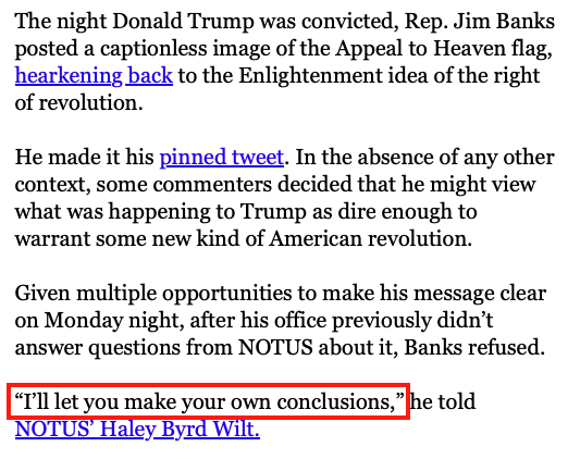 ICYMI, Indiana Congressman Jim Banks pin-tweeted an Appeal to Heaven flag on the night Trump was convicted in New York (~1 week after the Sam Alito ATH flag story broke).