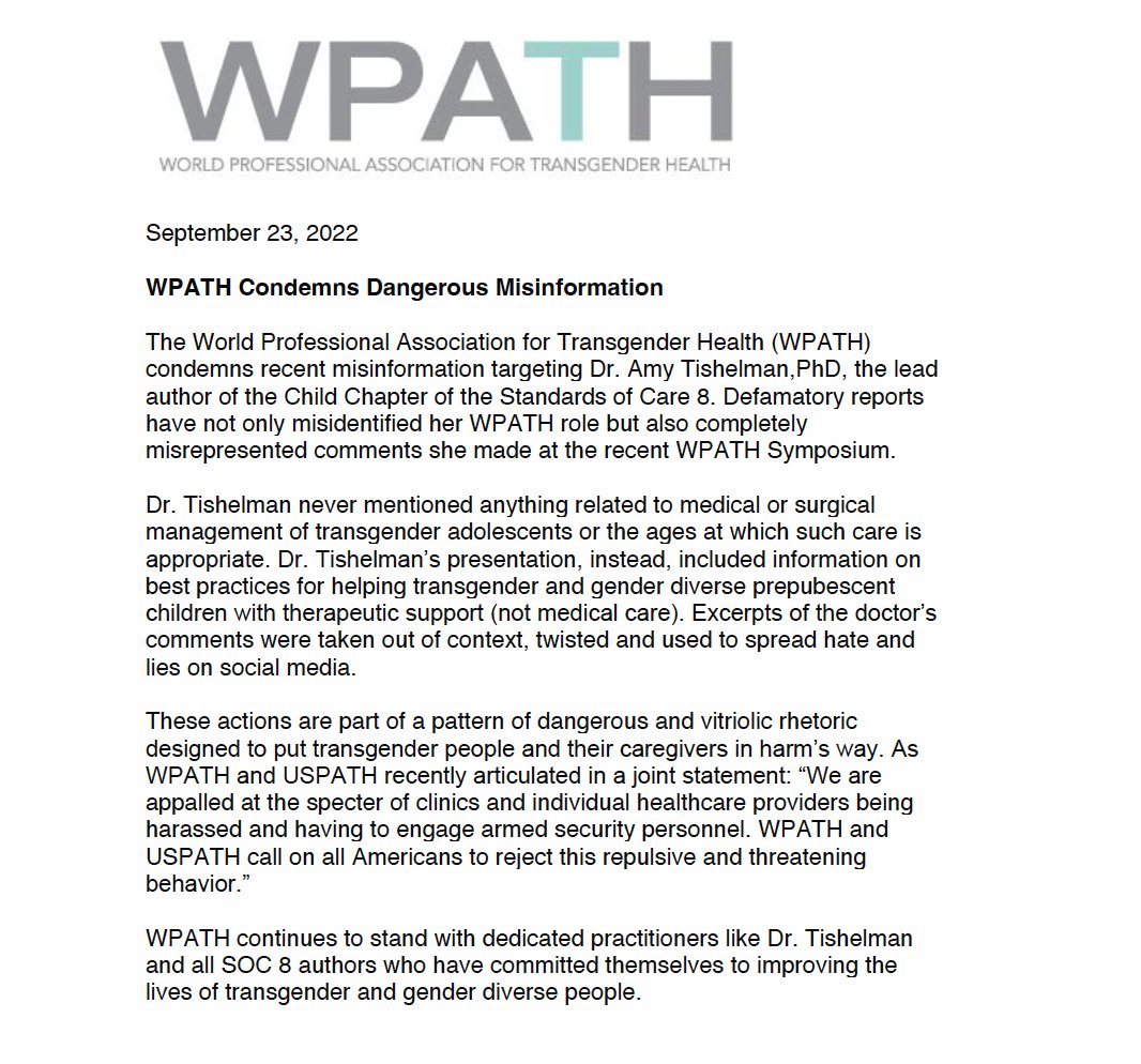 WPATH published its new transgender treatment guidelines on Sept. 10, 2022, and later that same day removed the age limits on pediatric gender-transition treatment. This was in the immediate wake of the @AmerAcadPeds and the @Trevor_Project pressuring them to do so.