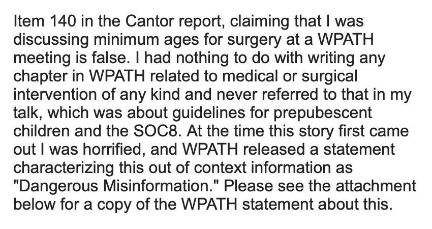 She stated: "Item 140 in the Cantor report, claiming that I was discussing minimum ages for surgery at a WPATH meeting is false. I had nothing to do with writing any chapter in WPATH related to medical or surgical intervention of any kind and never referred to that in my talk, which was about guidelines for prepubescent children and the SOC8. At the time this story first came out I was horrified, and WPATH released a statement characterizing this out of context information as 'Dangerous Misinformation.' Please see the attachment below for a copy of the WPATH statement about this."