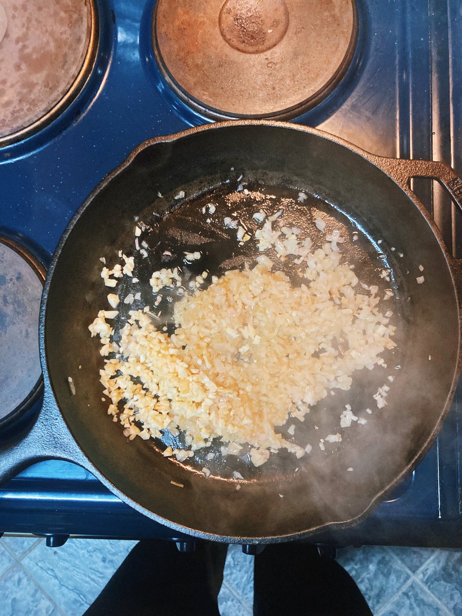 In a skillet or frying pan, over medium heat, add a good amount of olive oil. When hot, add in the shallot and cook for five minutes, until translucent and fragrant. Then, add the garlic and cook for a further two minutes. Stir these around every 30 seconds so they don’t burn.