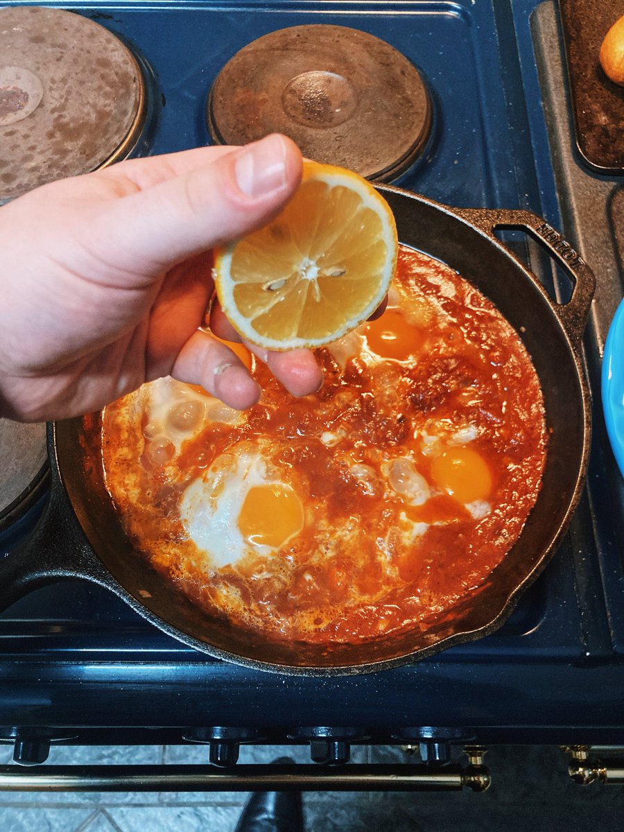 Firstly, your ingredients. There are many variations but this is the baseline recipe. You need: a can of peeled plum tomatoes, two shallots, a few cloves of garlic, harissa paste, cumin, a lemon, and four eggs. This will make two servings.