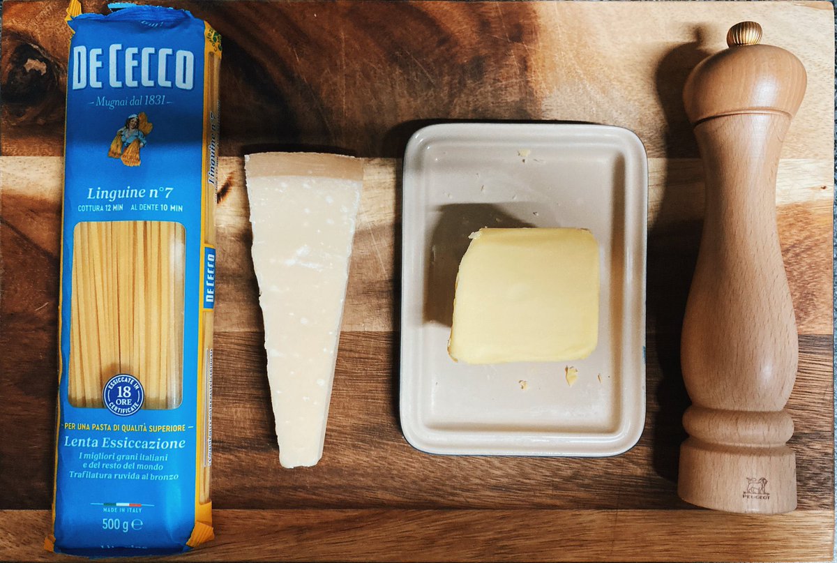 160g spaghetti, 2 eggs, 100g guanciale (or pancetta if you can’t get it), 150g pecorino Romano cheese, and black pepper. You’ll also need salt and water.