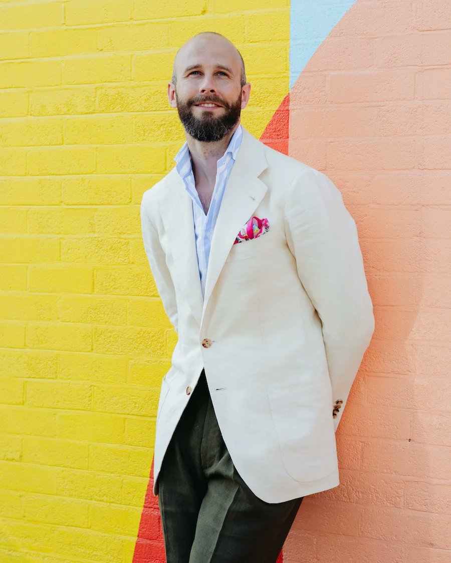 Outfits often benefit from having a finishing layer, but when the weather is very warm, sometimes this can be just an open shirt. Try textured fabrics and camp collars. Proper Cloth is an online MTM shirtmaker with endless options. Play with proportions (e.g. high rise pants)