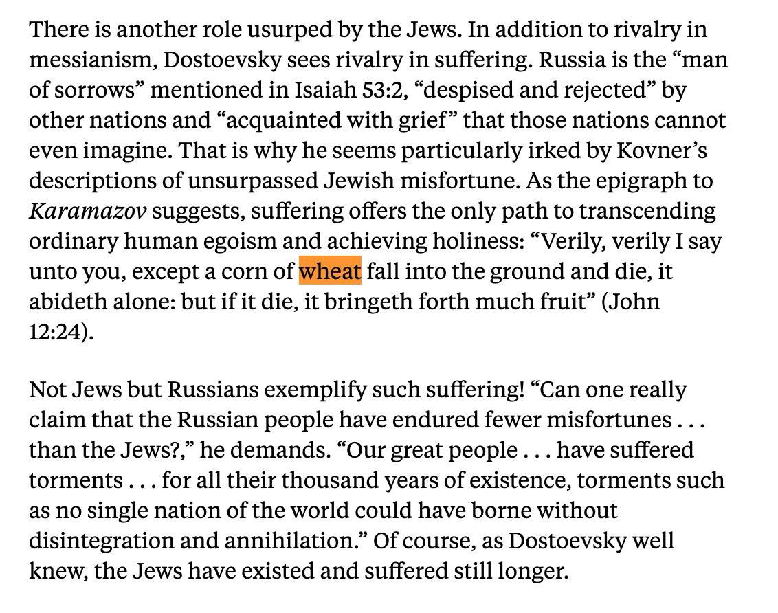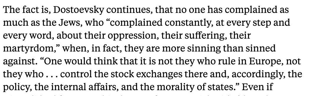 There are many excellent points in the piece but perhaps the standout is that Dostoevsky said that he has no innate bigotry against Jews, but hates them because of the things they do.