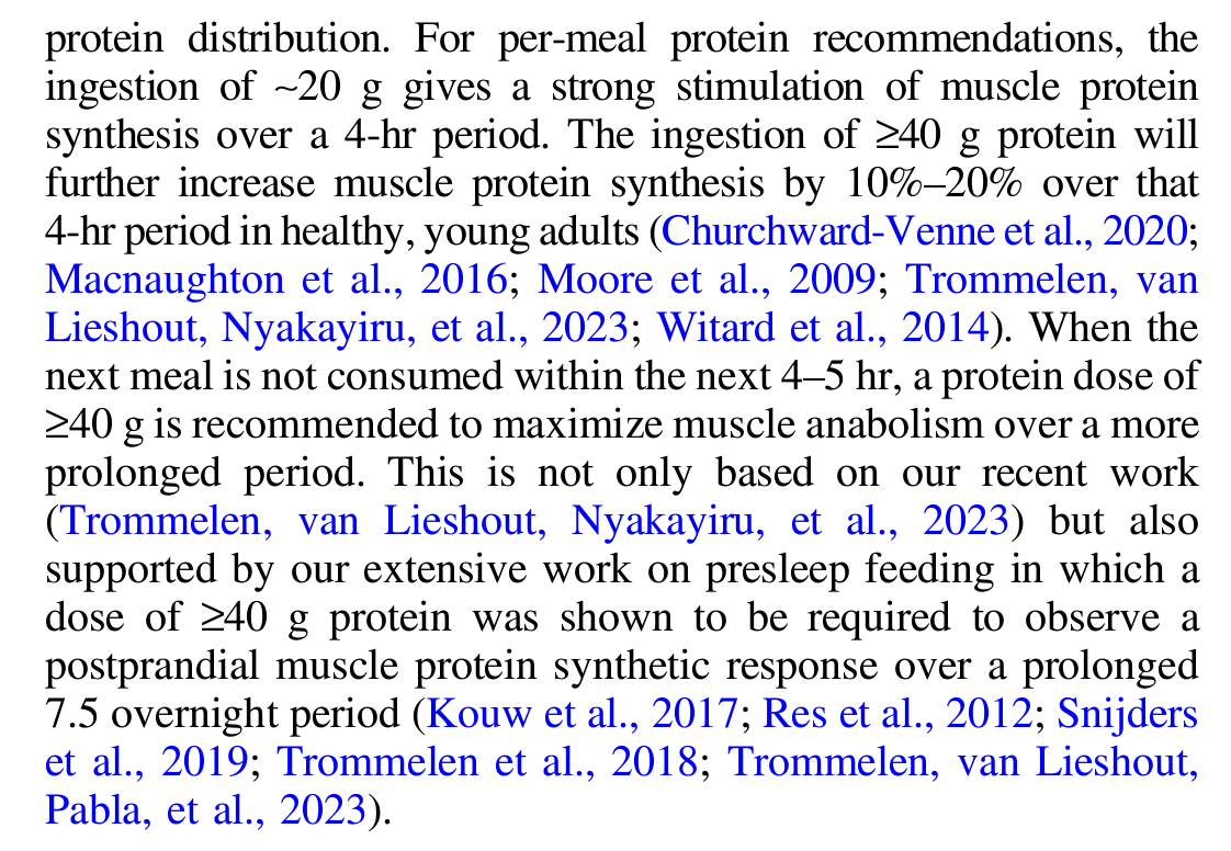 In practice, most protein is consumed as whole-food mixed meals that are slowly digested and will sustain high levels of plasma amino acids and anabolism throughout the day...