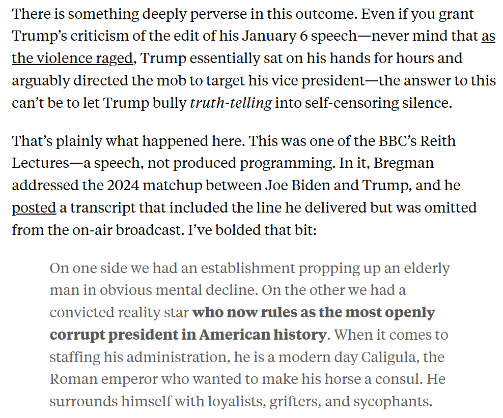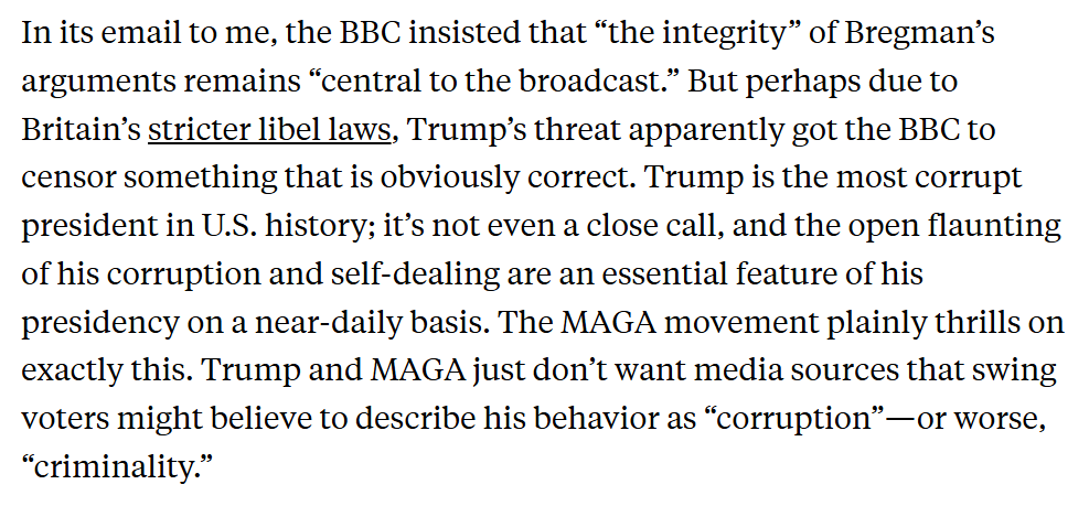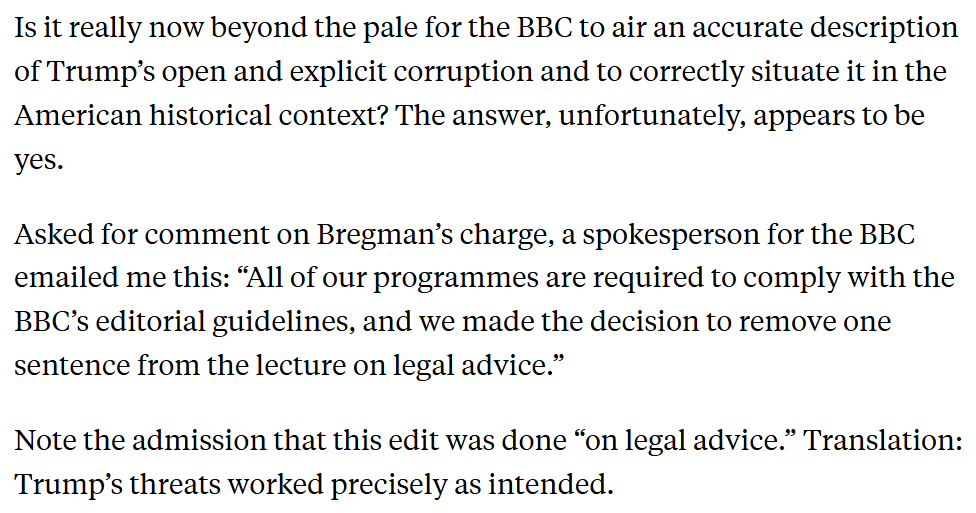 Today @rcbregman posted a transcript of his Reith Lecture showing that the version that BBC aired removed the line about Trump's world-historical corruption.