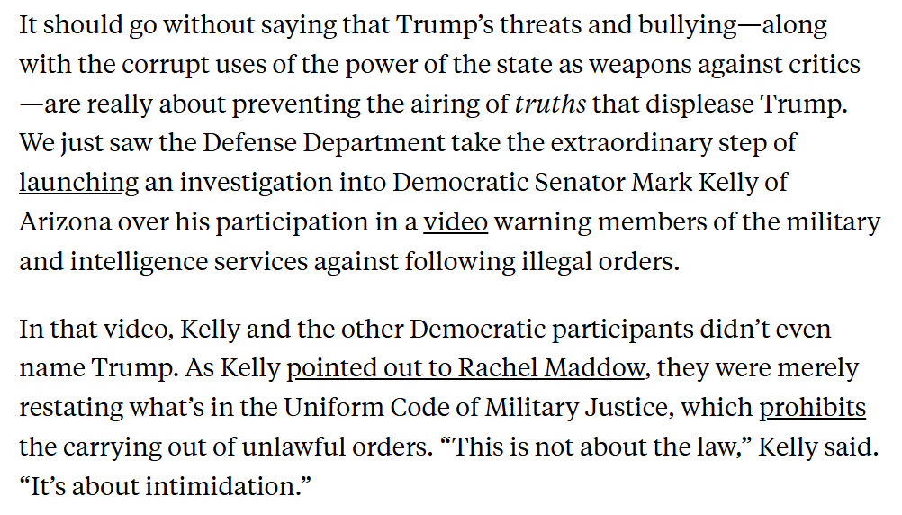 @rcbregman Trump is the most corrupt president in US history, and the openness of his corruption is an essential feature of it. It's extra bad that this comes as the Defense Department punishes Sen Mark Kelly for correctly warning against breaking illegal orders.