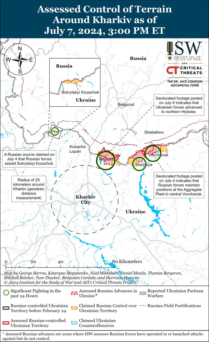 Ukrainian forces recently advanced during tactical counterattacks north of Kharkiv City amid continued fighting north and northeast of Kharkiv City on July 7.
