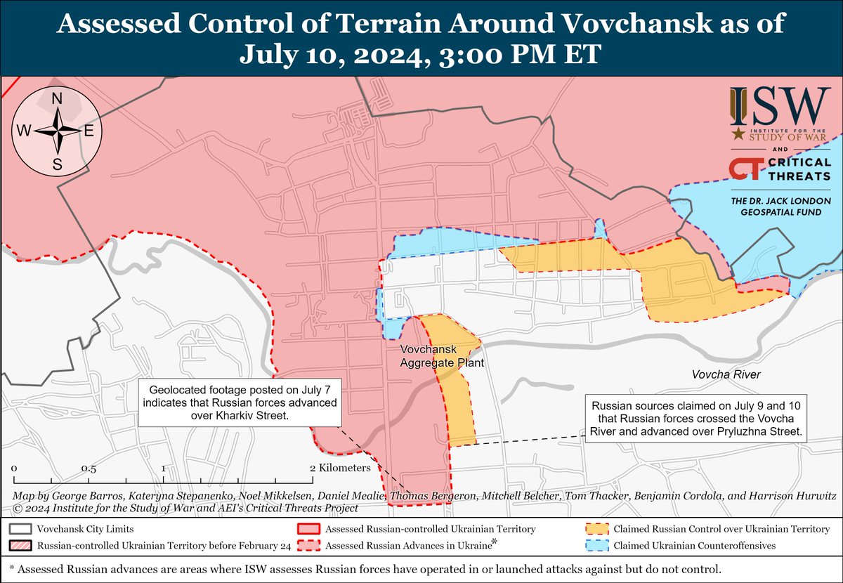 2/ Russian forces recently crossed the Vovcha River into central Vovchansk amid continued fighting north and NE of Kharkiv City. Geolocated footage published on July 7 shows that Russian forces crossed the Vovcha River and hold positions on Kharkiv Street in central Vovchansk.