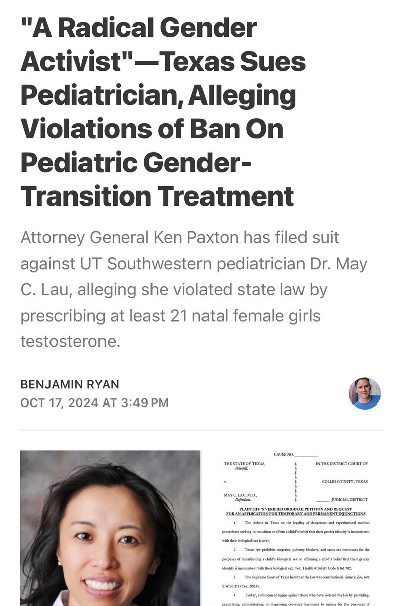 Update: The Texas doctor sued by Ken Paxton for allegedly prescribing gender-transition drugs to minors after the state’s ban went into effect has surrendered her medical license. She had written the prescriptions under the diagnosis “endocrine disorder not otherwise specified.”