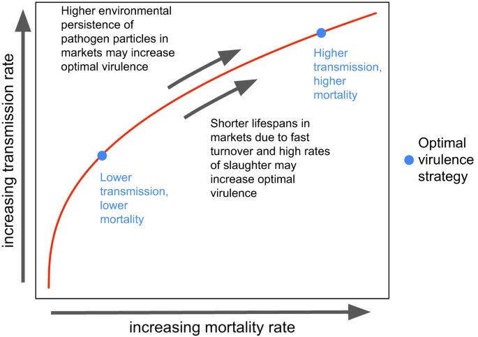 2) Live bird markets may drive the evolution of highly virulent poultry pathogens like H5N1. Faster turnover rates and higher environmental persistence of viral particles in markets compared to farms could select for increased virulence ...