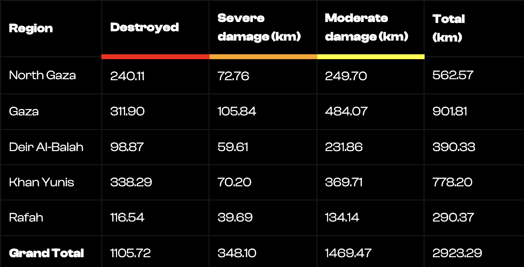 The destruction of Gaza is designed first to kill, then expel & finally segregate the general Palestinian population into small enclaves by selectively destroying critical life-giving infrastructure. Based on Unosat imagery on May 29, 65% of Gaza's roads are destroyed & damaged.