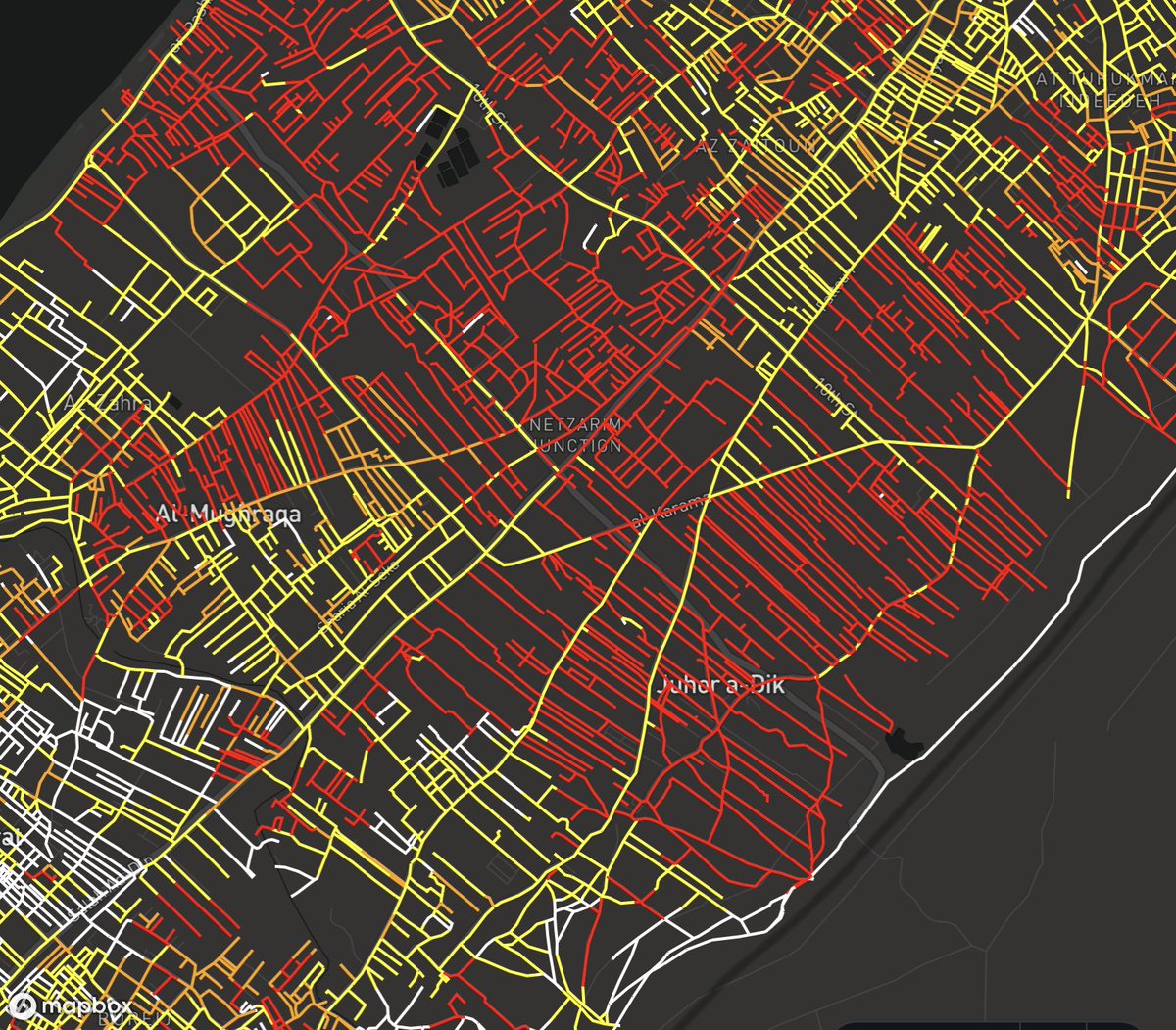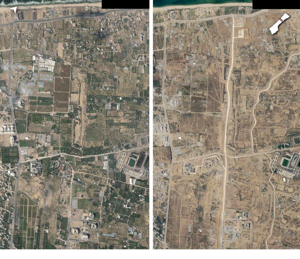 Here is a zoomed-in image of the Netzarim Corridor with accompanying images to show the destruction intended to bisect Gaza. This method of creating small, ethnic zones that are disconnected from each other is deployed across the West Bank as a means to create political divisions