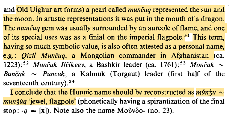 His father's name, muncuq, meant Jewel and is related to a turkish legend surviving in Old Uighur art forms about a gem/jewel kept in the mouth of a dargon.