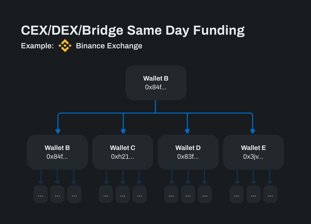 Within the same hour, we've identified wallets funded by the same CEX cluster, such as Binance. This is a single heuristic in a model that can support hundreds, if not thousands, of rules.
