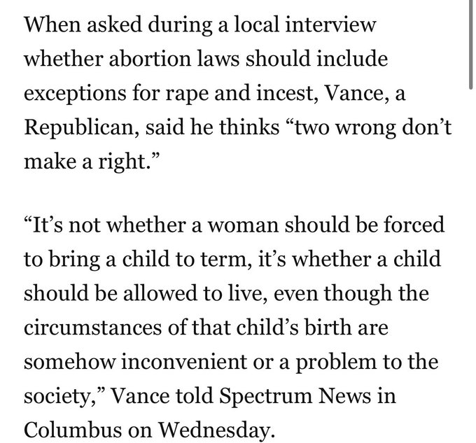 Vance representa ahora el discurso más ácido del conservadurismo extremo. Llegó a puntos tales como pedir la prohibición del aborto, incluso si era producto del incesto o la violación. En el caos de esta última, la califico como una “circunstancia inconveniente”