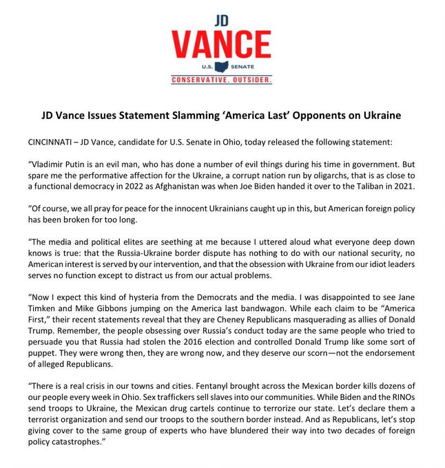 Update sobre las ideas de Vance que corroboran el contenido del hilo Su equipo emitió una declaración en la que afirma que Putin " es un hombre malo" pero que hay que cortar la asistencia a Ucrania porque es una "democracia disfuncional" y "corrupta gobernada por oligarcas"