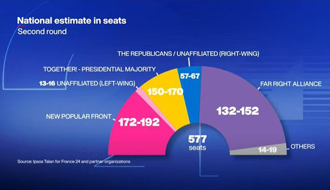 Tal como se explicó al realizarse las elecciones europeas, la maniobra de Macrón era licuar el avance de Le Pen. Ahora estaría quedando segundo luego de agitar el miedo al avance del lepenismo y sin mayoría absoluta de ninguna fuerza, no deberá cogobernar hasta 2027