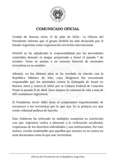 El gobierno argentino incluyó al grupo pro ianí Hamas dentro de su lista de organizaciones terroristas. Esta medida agiliza la vigilancia, detección y persecución de las entidades y personas que operan a favor de esa organización dentro del país