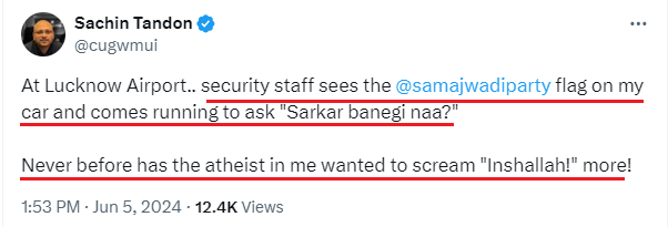 Sachin Tandon is an atheist but wanted to shout Alah Hu Akabar when the security guard asked him about SP's victory after seeing the Samajwadi Party's flag on his car.